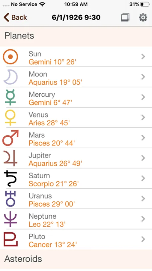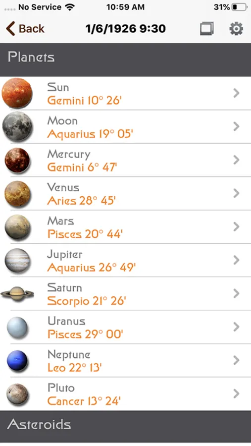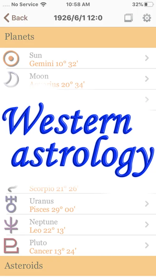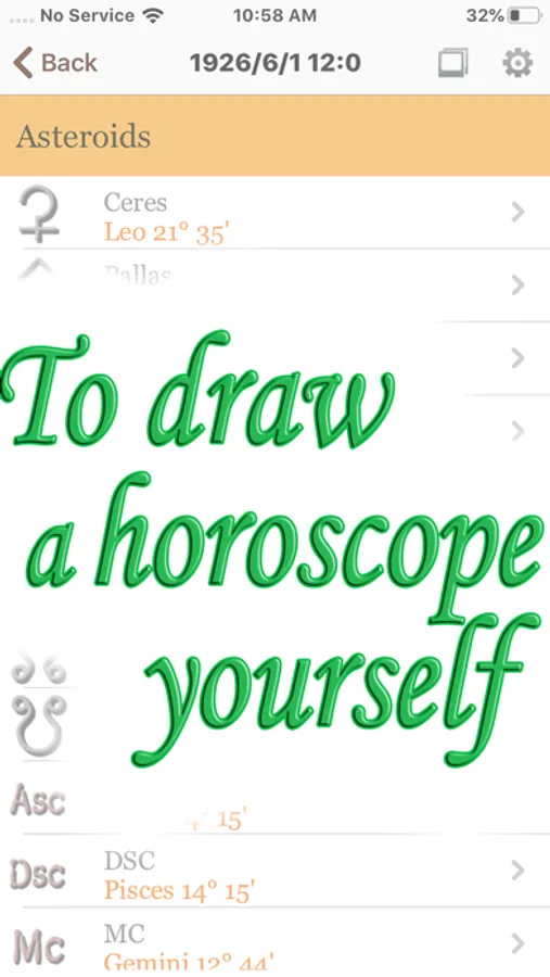 The App becomes a horoscope of 21 sensitive points: 15 sensitive points by planets and asteroids in the solar system and 6 sensitive points by DH, DT, MC, IC, ASC, and DSC.