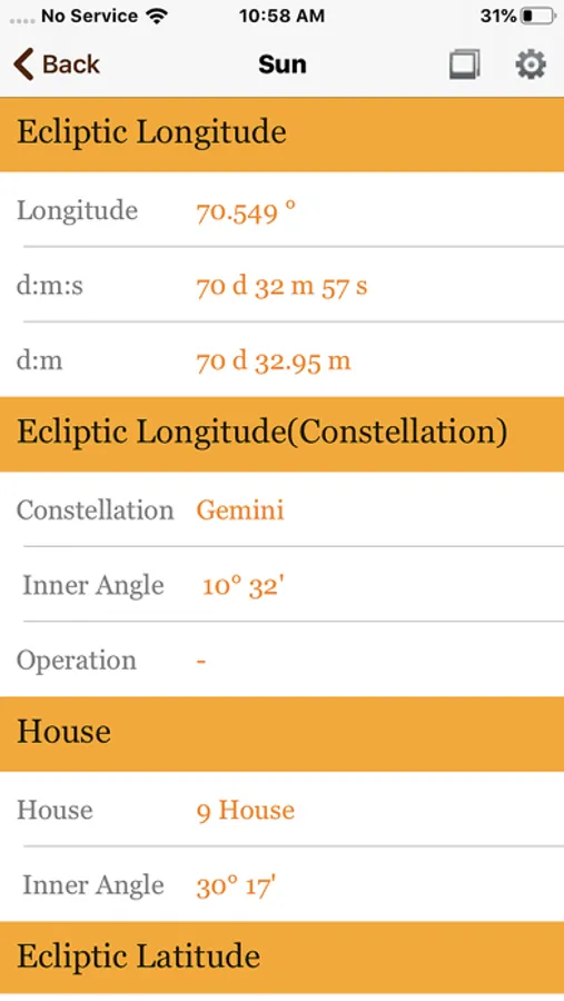ecliptic longitude, constellation, angle, right ascension, right ascension(J2000), (celestial declination), etc.