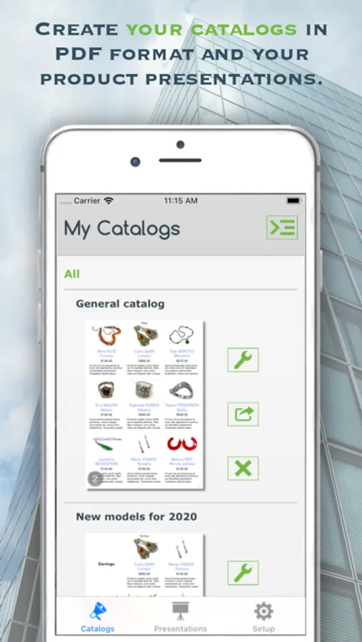Create, manage, and then show from your iPad or iPhone your own catalogs in PDF format and product presentations (see screenshots).