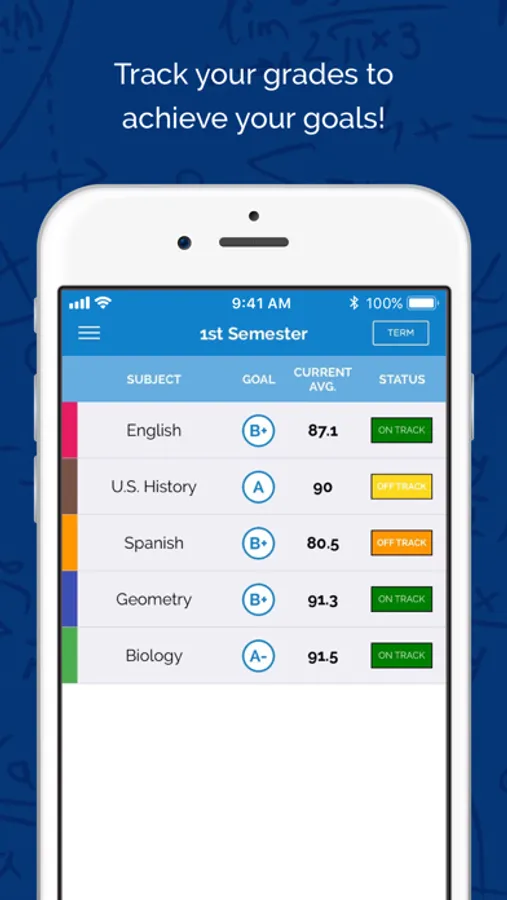 The Tracker shows your current average in each class based on the grades you have entered and compares it to your goal. There are also graphs that show you how you are doing at any point during the year. The graphs help you quickly identify areas of weakness so you can put in extra study time before an exam or go see a teacher for explanation.