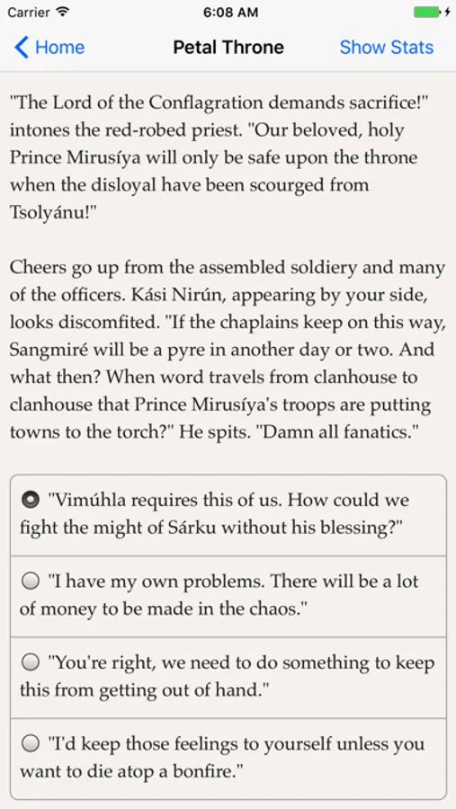 "Choice of the Petal Throne" is a 124,000-word interactive fantasy novel by Danielle Goudeau, where your choices control the story. It's entirely text-based--without graphics or sound effects--and fueled by the vast, unstoppable power of your imagination.