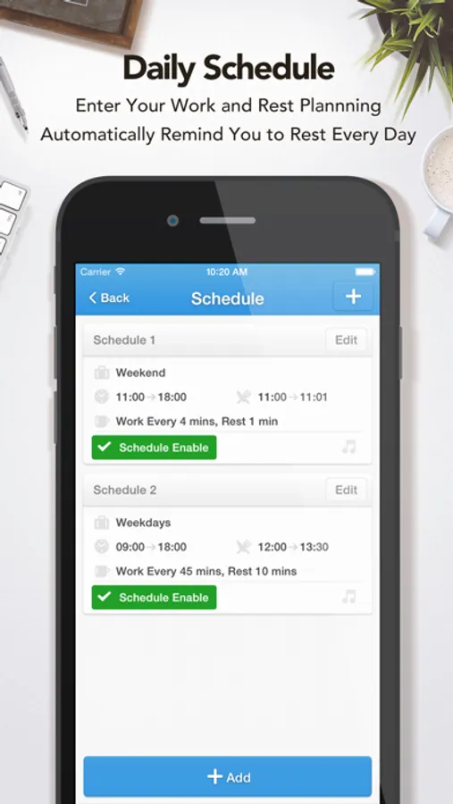 1. Daily Schedule: Enter your work and rest plannning, automatically remind you to rest every day