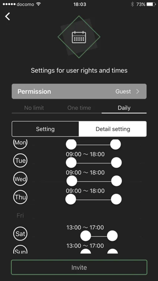By entering the telephone number of your friends on the “invitation” screen, you can transfer opening rights to other people. The opening rights can be set to specific time slots.