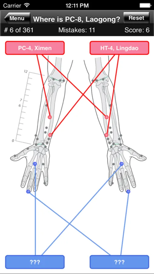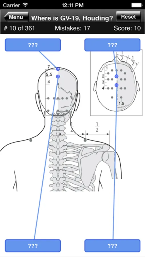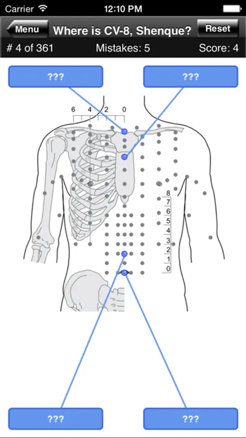 Each question has 4 possible answers. When you tap one of the answers, the default color of the pressed button/point is changed to green (when it was the right answer) or to red (wrong answer). You have 3 attempts to give the right answer. If you give it at the first attempt you will receive 3 points, at the second attempt - 2 points, at the third - 1 point. Play the "Acupuncture Points Body Quiz" now to test and improve your knowledge of the acupoints locations!