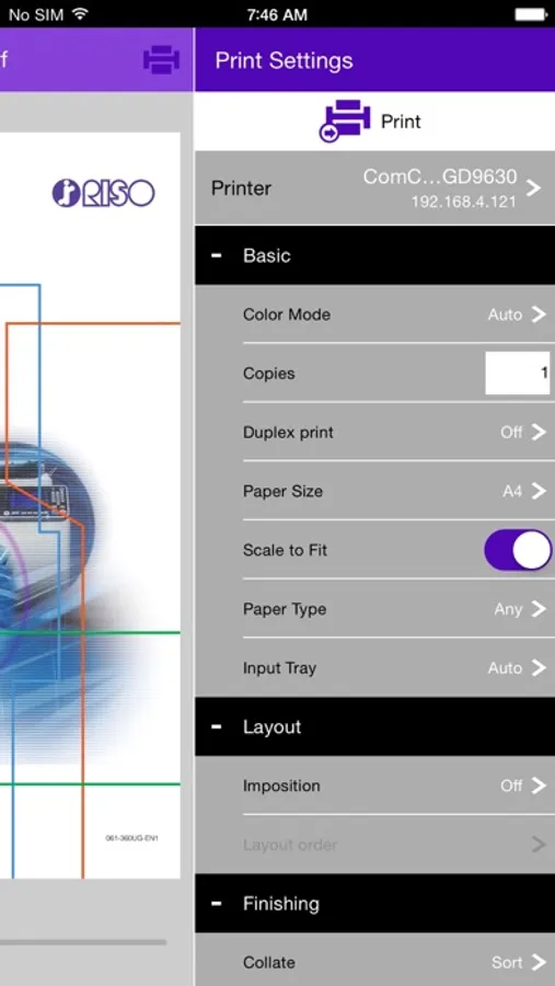 RISO PRINT-S is an application to print PDF, text, or photo/image data directory from the tablets or the smartphones.