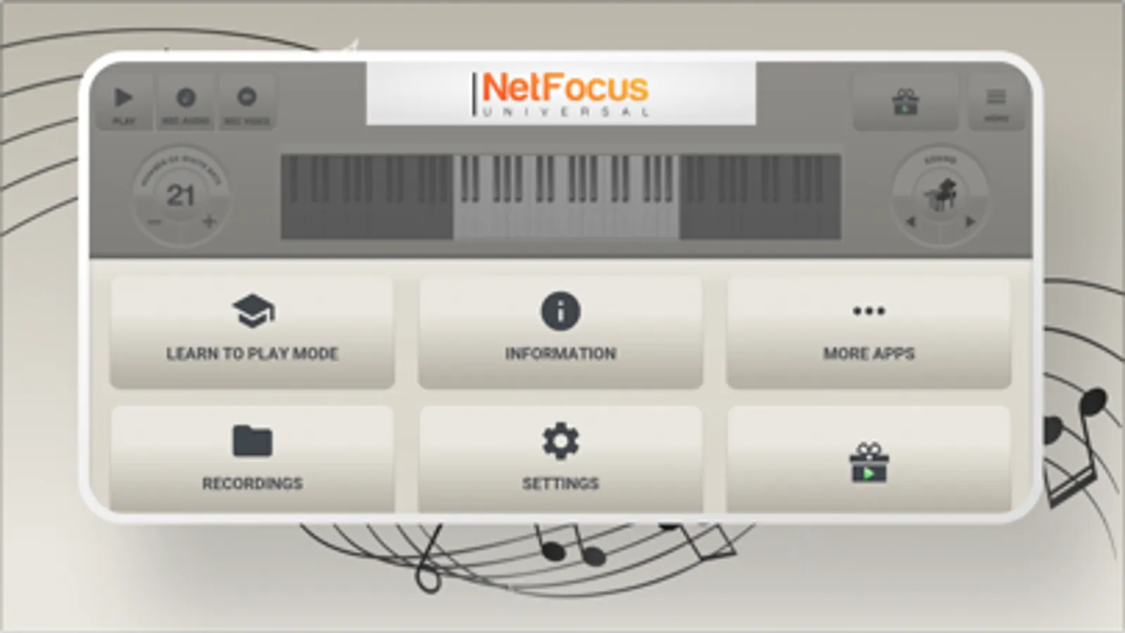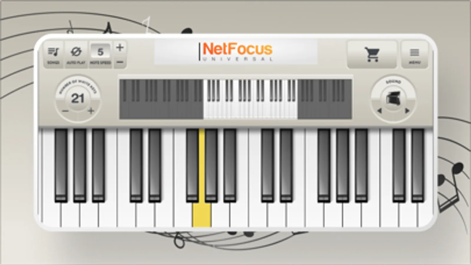Most important buttons for functions are placed above the piano keyboard for best user experience and easy overview. If you have your own piano sheet music; you can choose to show label on keyboard piano keys in settings.