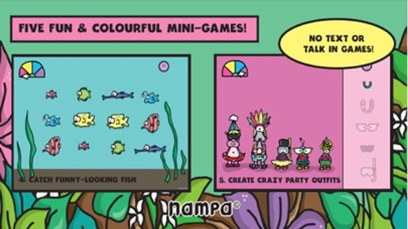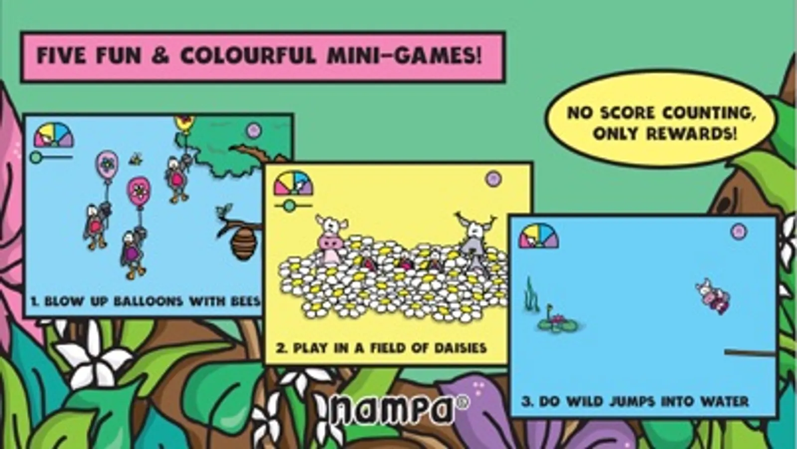 Nampa Forest includes five mini-games. The kids can play with the characters in a field of daisies, blow up balloons with help of bees, do wild jumps into water, catch some funny-looking fish and create crazy outfits for the final party! And of course there are lots of surprises in between.