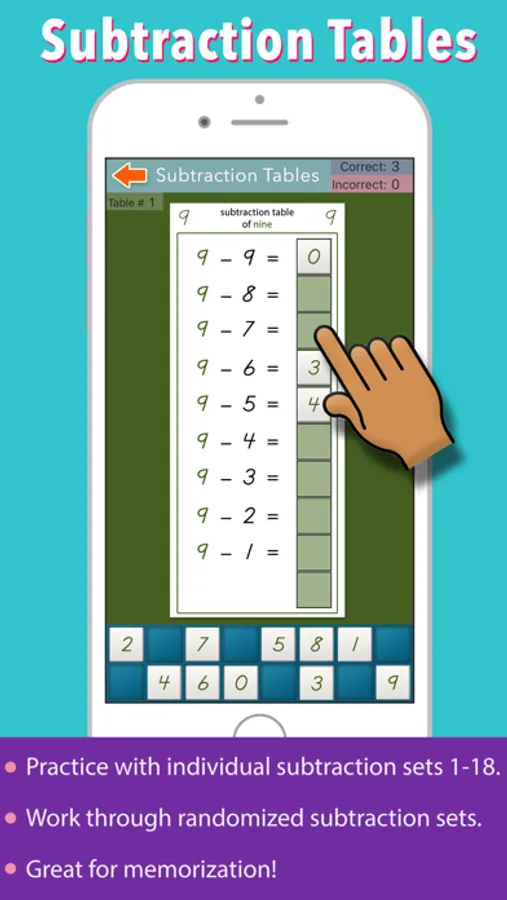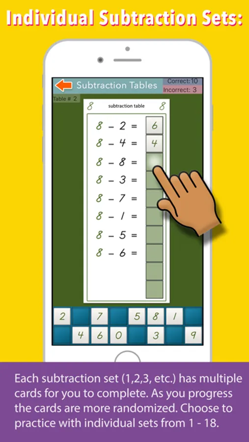 Children can practice individual subtraction sets, such as 7-1, 7-2, 7-3, etc. The child can fill out the cards in any order they choose and can do so using the automatic or drag & place method.
