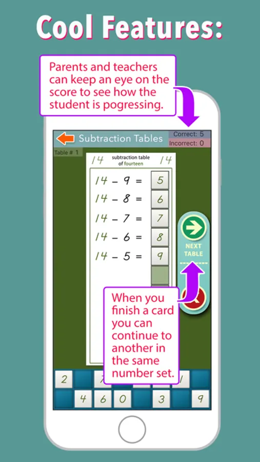In a subtle way, the app keeps track of the child's progress, with a score or a timer, so parents and teachers can review their activity. Children can cycle through multiple cards that are randomized within each number set. Included is a set that includes randomized cards drawing from all the number sets (1-18).