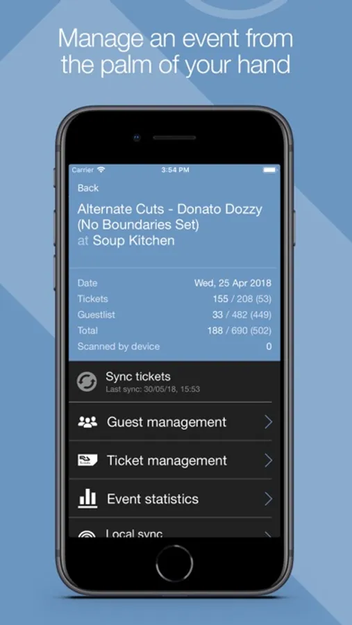 - Manage your club night or festival from the palm of your hand. Update ticket allocations, stop and start sales and view detailed, real-time stats on your event.