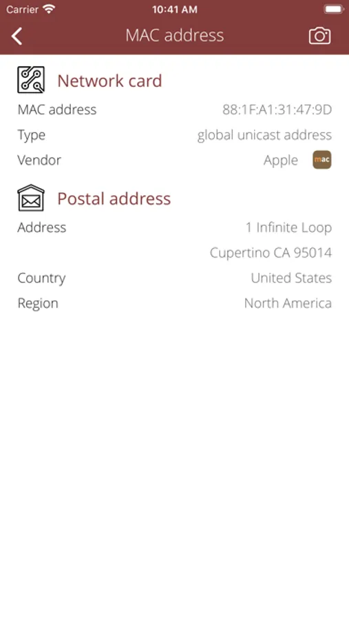 • Show MAC address, MAC vendor, country, postal address.