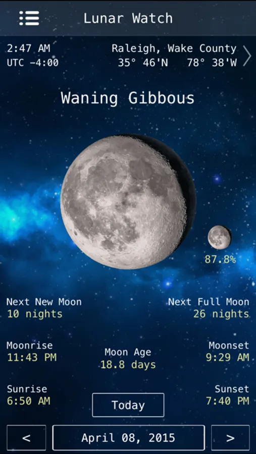 Lunar Watch provides accurate, attractive Moon and Sun details at a glance. See what the moon will be like on a certain date at any location in the world. You can quickly see what the moon looks like in the future and in the past by swiping left or right with your fingers. Customize the background to a theme that is most appealing to you.