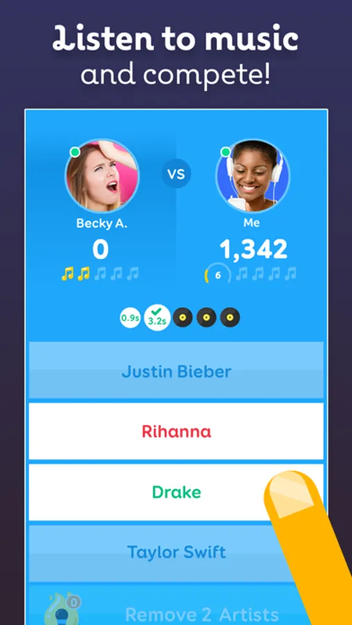 In Practice Mode, meet Melody, the SongPop mascot, and practice your song quiz skills with her in solo mode. All playlists are free so you can try to guess that song you heard in a commercial, and discover more music samples every day. Buy your favorites and challenge your friends in this music trivia guessing game. Find your best matches every day: Play with users who share the same musical taste and have some fun.