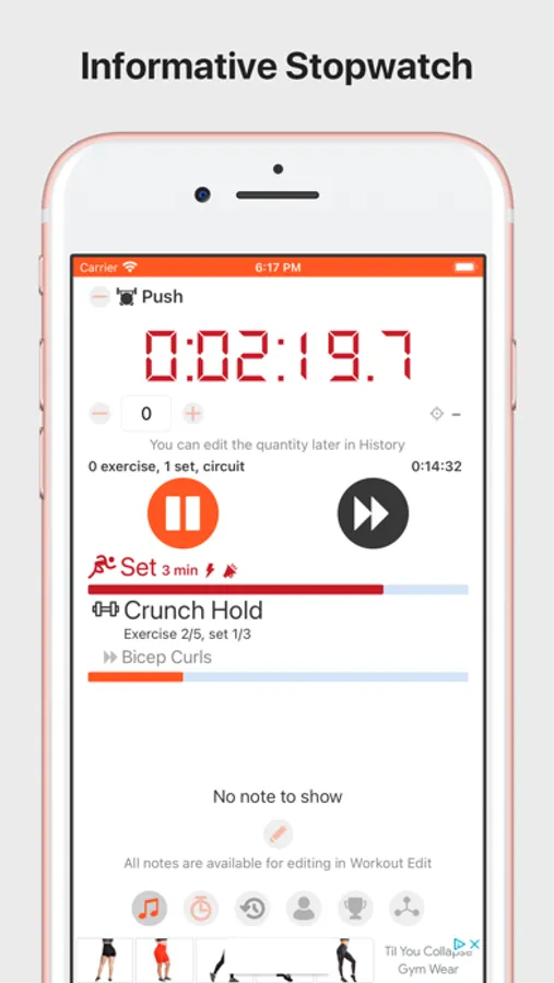 - Next button to move to the next exercise if you finish the current one early or hit your duration goal.