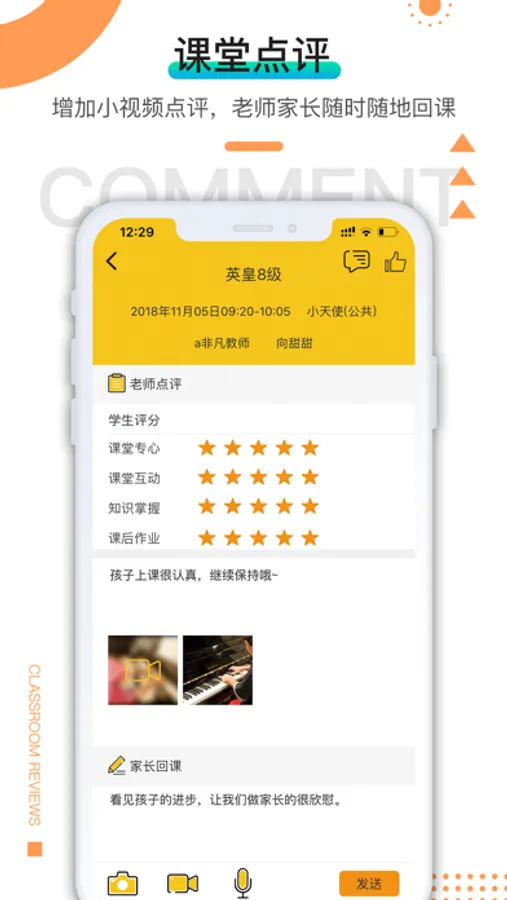 老师可以在APP端直接对已上课程进行点评,真正实现简单快捷操作。家长能立刻得到孩子的课堂表现反馈以及老师课堂上布置的作业内容。