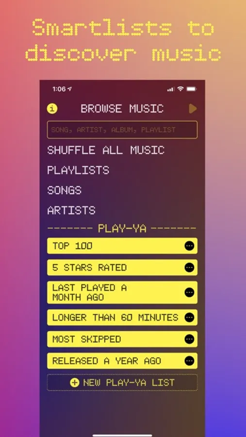Play-ya List is a smart playlist app for you to discover your music by setting your own rules. Yep, that’s right. You. Set. Rules.