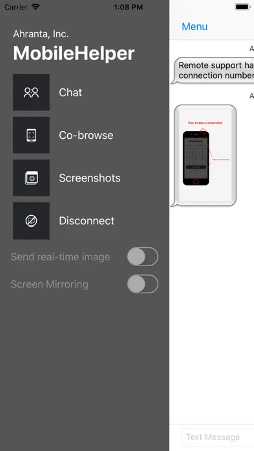 Customers enter the access code is simple and can be conveniently remote assistance with the touch of a connection. Customers can text chat with an agent and the agent is possible to identify the target device support, and system status in real time. At the request of the agent's customers can easily share the screen with just capture the screen of the device. An agent can give an intuitive help using the drawing functions to capture images as required by the customer. MobileHelper automatically enables real-time sharing with the permission of the customer as long as the app screen. All operations are carried out in the customer's consent.