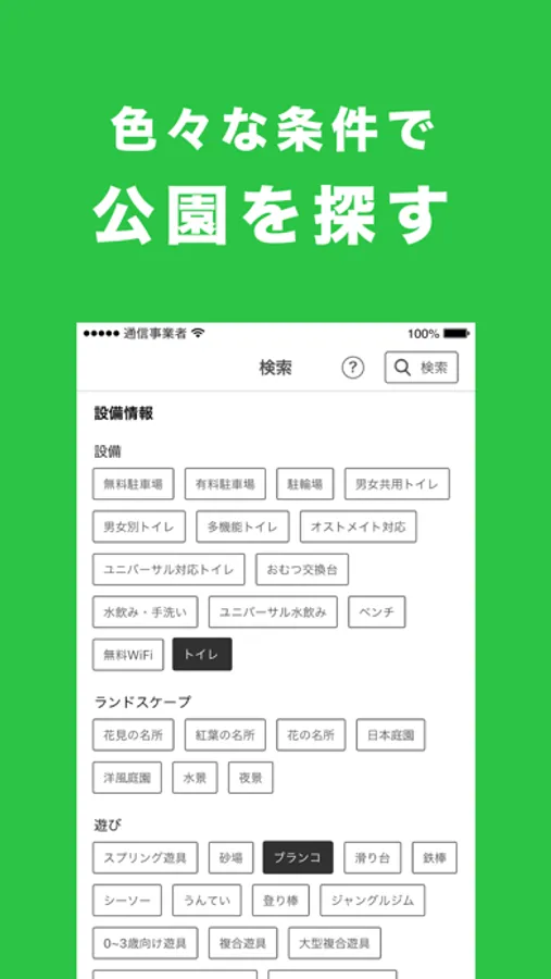 > キーワードやエリア、規模などお好みの条件で公園検索もできます。