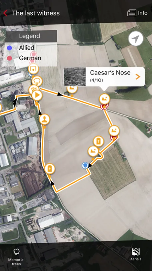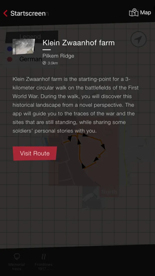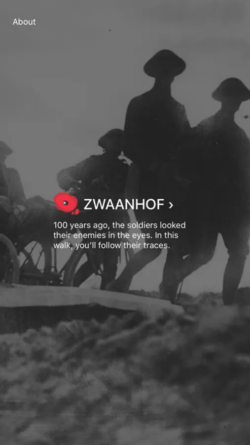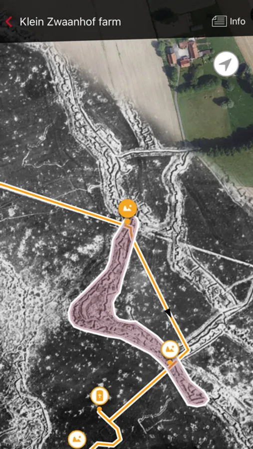 This app helps you explore the war landscape around Ypres. It will immerse you into the First World War and help you unveil the vestiges of battle and the historic sites. More exciting still, the app allows you to virtually walk on top of the front line trenches. So that you experience how incredibly close the front lines were to one other and how dense the trench network was. As a visitor you can discover at 'Het Zwaanhof' the frontlines and the memorial trees which mark their location and enjoy a view of `then and now’ through aerial photos.