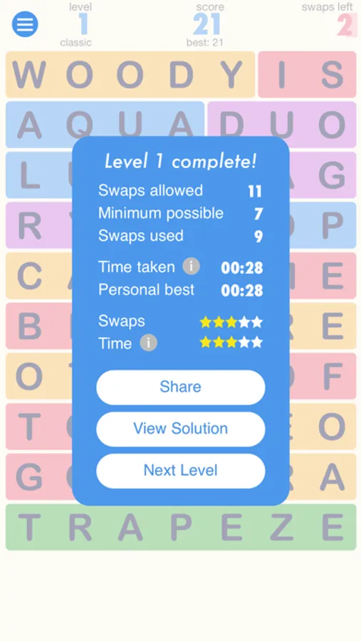 Test your word skills and spot patterns to crack the levels. The puzzles get harder as the game progresses and you only have a limited number of swaps to use.