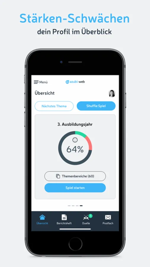 azubi:web - Das erste Lernspiel für Auszubildende. Du bereitest dich während der gesamten Ausbildungszeit auf deine Klausuren, Deine Abteilungen und die Zwischen- und Abschlussprüfung vor - zeit- und ortsunabhängig. Ein sofortige Stärken und Schwächenanalyse zeigt Dir gezielt, welche Bereiche du verbessern solltest. Sofortiges Feedback mit kurzen Infotexten bringt den Spaß zum Lernen.