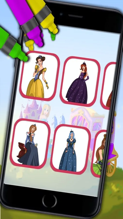 "Enter the magical world of the beautiful princesses. Color the drawings of the best scenes from the fairytales. Enjoy this addictive coloring pages for all ages!