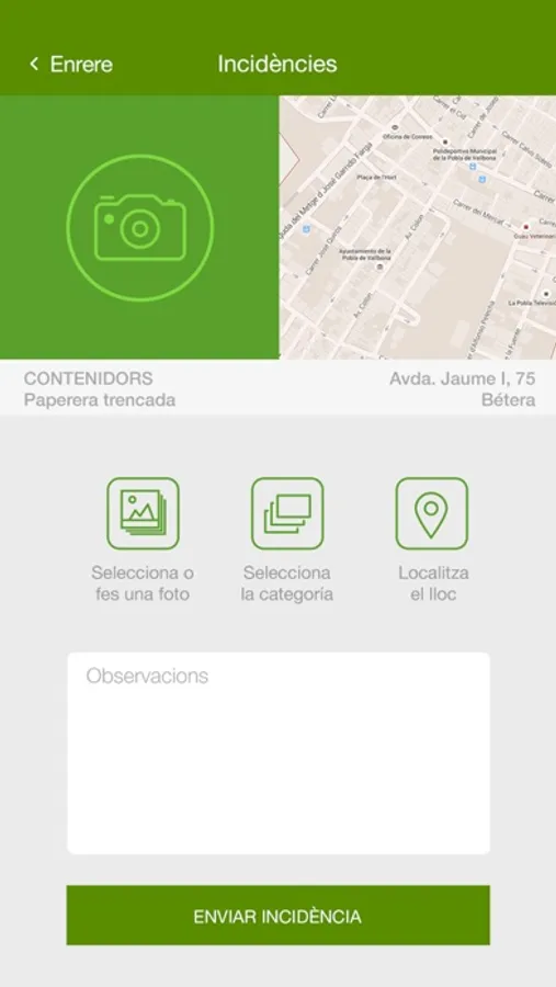 Todas las incidencias son registradas, analizadas y remitidas al departamento responsable. El registro de la incidencia se hace mediante geolocalización para determinar el lugar de la incidencia.