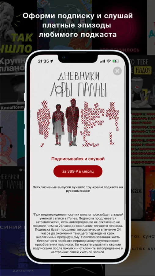 Стоимость подписки зависит от страны, в которой вы производите покупку. Стоимость снимается с вашей карты при оплате через аккаунт iTunes. Ваша подписка будет обновлена автоматически, если вы не откажетесь от этого хотя бы за 24 часа до окончания ее периода действия. Вы не сможете отменить подписку, когда она активна. Управляйте подписками сразу после покупки в настройках аккаунта.