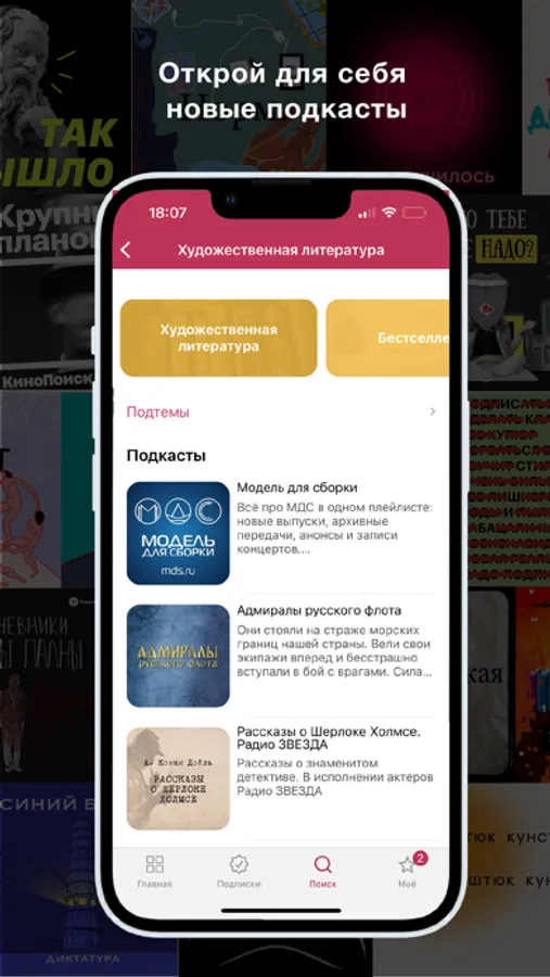 Найди подкаст, аудиокнигу или аудиоспектакль по ключевым словам, авторам или каналам, а также открой для себя новые подкасты по разным темам.