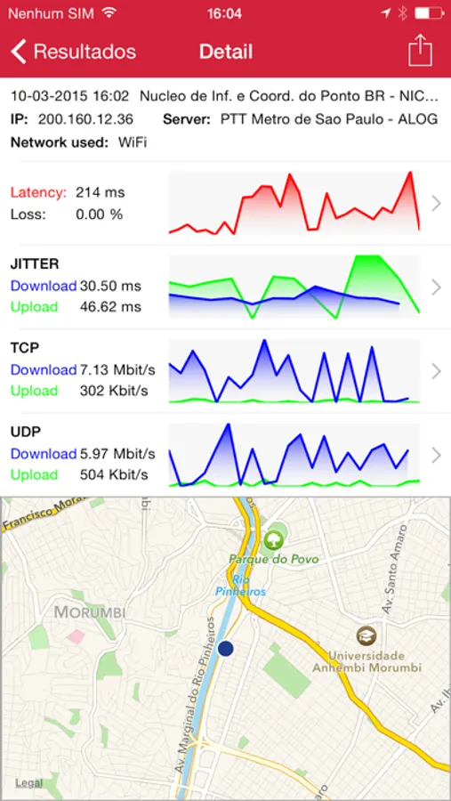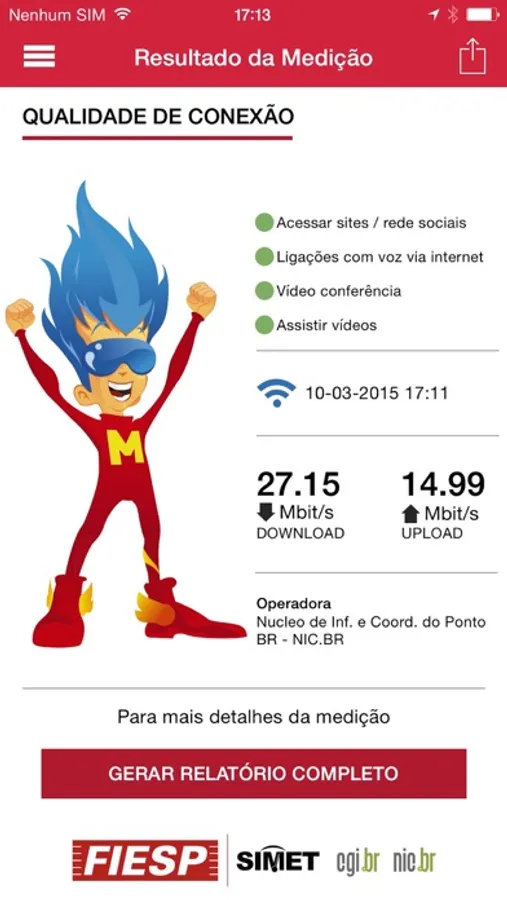 Há ainda a opção de um relatório completo, com todos os valores de velocidade (download e upload), jitter, latência e perda de pacotes.