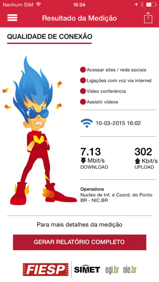 Ao final dos testes é apresentado um relatório simples e objetivo, indicando a qualidade da conexão para: Ligação com voz via internet; Videoconferência; Jogos on-line, e Velocidade.