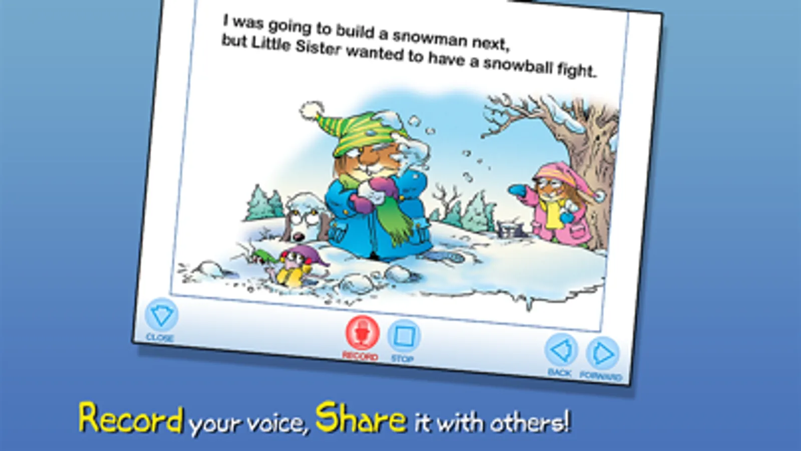 Hooray! It is a snow day! And what a perfect time to make a snowman. But Little Sister needs help putting on her boots, Dad needs a hand with the shoveling, and Gator wants to build a fort. Will Little Critter ever get to build a snowman? Join Little Critter in this interactive book app as he enjoys his snow day. Explore pictures, learn new vocabulary, and personalize the story with your own narration.