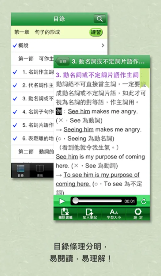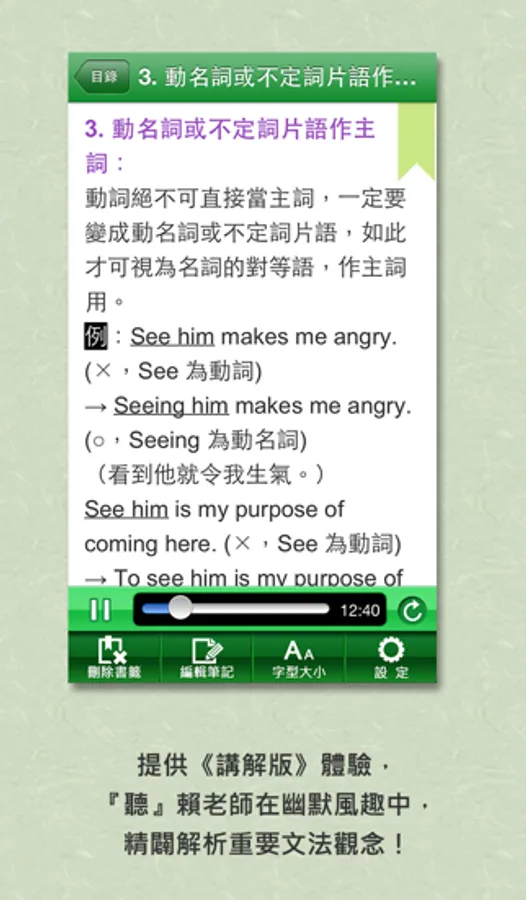 3.搭配有聲講解版: 賴世雄老師與台大教授Karen Chung老師,針對內容旁徵博引的講解,讓讀者隨時隨地『聽』英文文法,以加強印象。(Lite版搭配第1章第1節《講解》提供體驗)