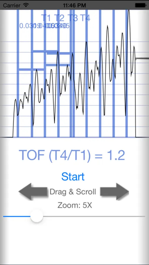 During administration of general anesthesia, neuromuscular blockade is best measured with a train-of-four (TOF) ratio technique, which utilizes a nerve stimulator and a measurement device, such as mechanomyography. During TOF stimulation, the nerve stimulator causes a short burst for four muscle twitches. The force of each twitch is related to the degree of neuromuscular blockade. By dividing 4th to the 1st twitch height, one can assess TOF ratio. The ratio >0.9 is considered as safe for extubation of endotracheal tube and complete reversal from the neuromuscular blockade. Although nerve stimulators are widely accessible to anesthesiologists, the measuring devices are not. Therefore, instead of measuring TOF ratio, anesthesiologist generally rely on count of twitches and pharmacological reversal for everyone. This practice has been shown to be problematic. Data suggest that even mild degrees of residual paralysis (TOF 0.7-0.9) may be associated with significant impairment of respiratory and pharyngeal muscle function. Several studies have demonstrated that many patients continue to arrive in the postanesthesia care unit with TOF ratios <0.9. By combining the built in accelerometer in the iPhone along with the app, we have developed an alternative way of measuring the TOF ration. Our app development team included an anesthesia resident (RB) and an attending (MP) who, provided the medically relevant content, and a computer programmer (KT) to translate the vision into the computer's language. The next step will be a validation study of the predictive value of TOF ratio measured by iphone as compared with conventional mechanomyography devices and visual assessment.