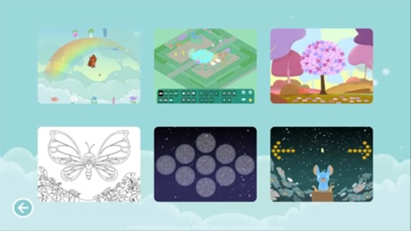 Six tranquil games provide the user endless options for peaceful fun. Grow a garden and spot a hummingbird. Visit a cherry-blossom snow-globe. Guide a butterfly to sip blossom nectar and reach a rainbow. Make music. And yes, catch a falling star!