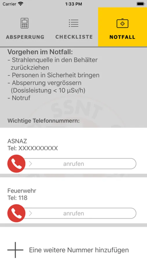The Swiss society for nondestructive testing (SSNT) has developped this App in collaboration with Suva. In particular it provides for the calculation of the safety distances for nondestructive testing in mobile operation in Switzerland or Liechtenstein and the alarming in case of emergency.