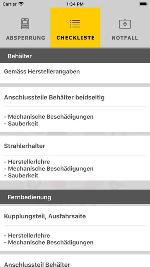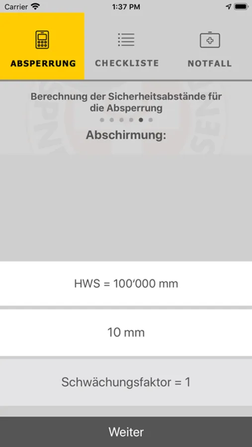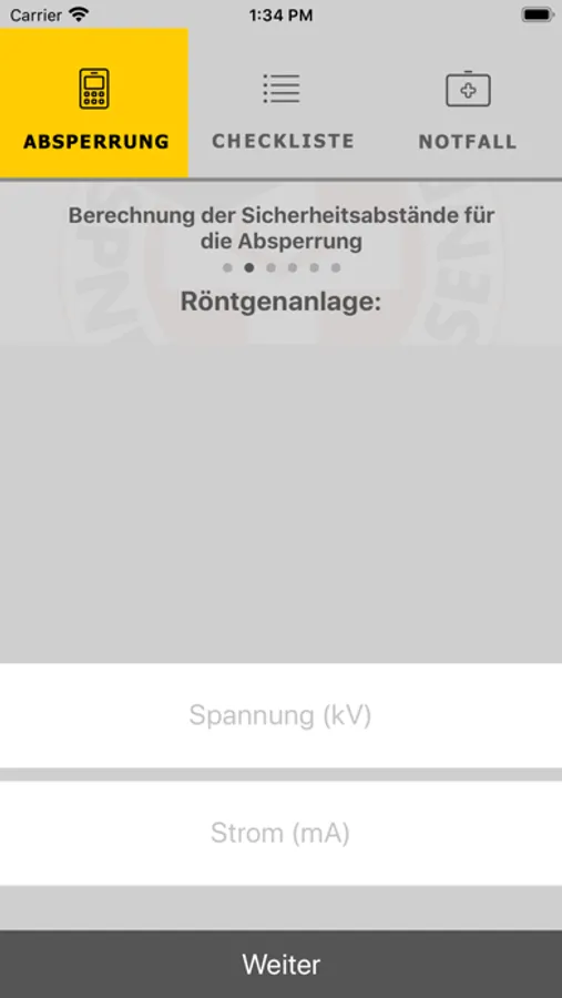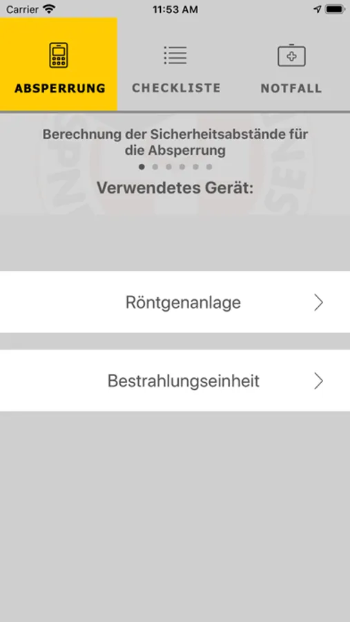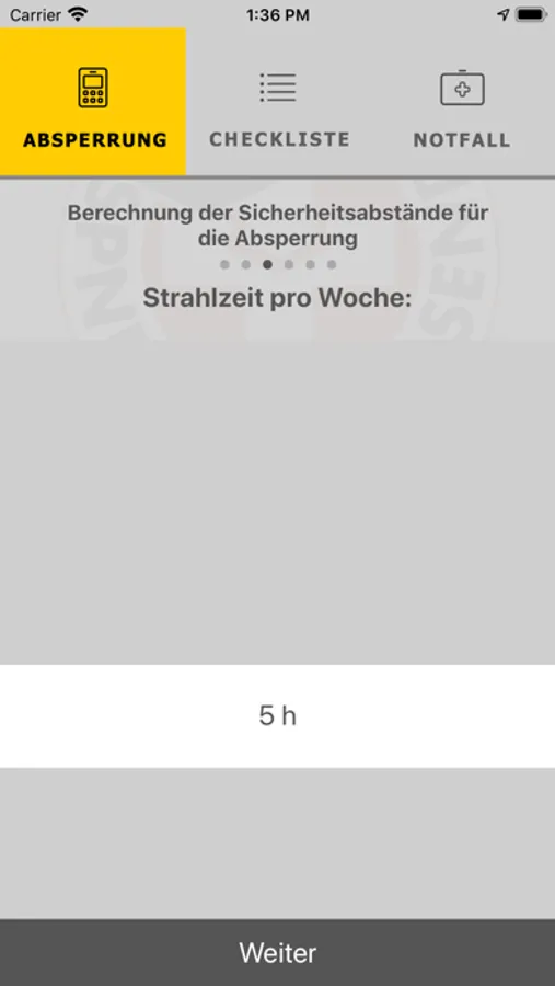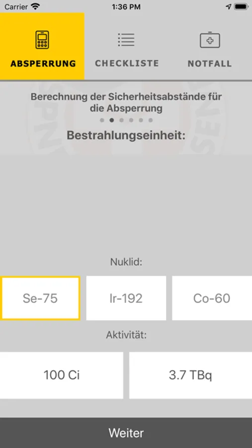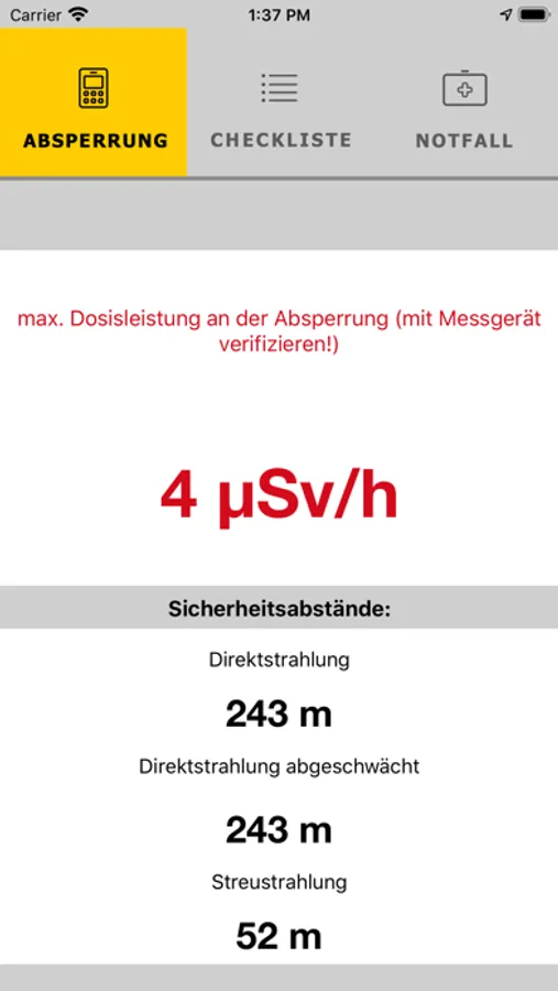 The calculation is based on the most common nuclides and tube voltages respectively and accounts for the shielding of the radiation. The app also contains a checklist for the daily inspection of gammagraphy equipment.