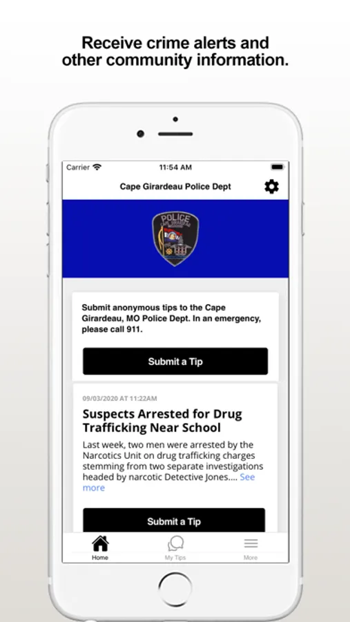 The CapePD Tips app provides citizens the ability to submit anonymous tips to Cape Girardeau, MO Police Department. The app also displays agency crime alerts and other organization web and social media content.