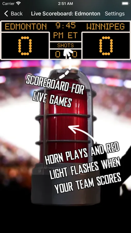 - Live Scoreboard Mode - Live scoreboard with game synced horn and red light for your favorite team! Red light flashes and team horn sounds when they score in lives games!