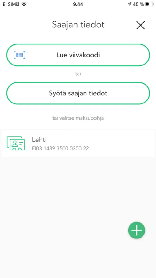 - maksaa maksuja lukemalla tiedot viivakoodista, syöttämällä tiedot tai käyttämällä maksupohjia