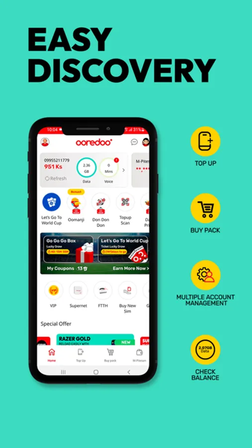 - Quick and easy way to buy packs, check balance, top up, buy sim and etc…