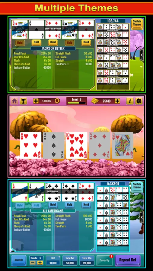 Videopoker comes with a variety of unique themes! Play with the theme that’s perfect for you.