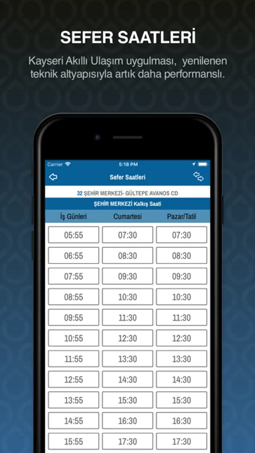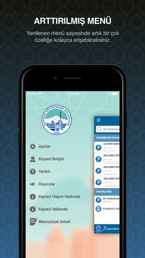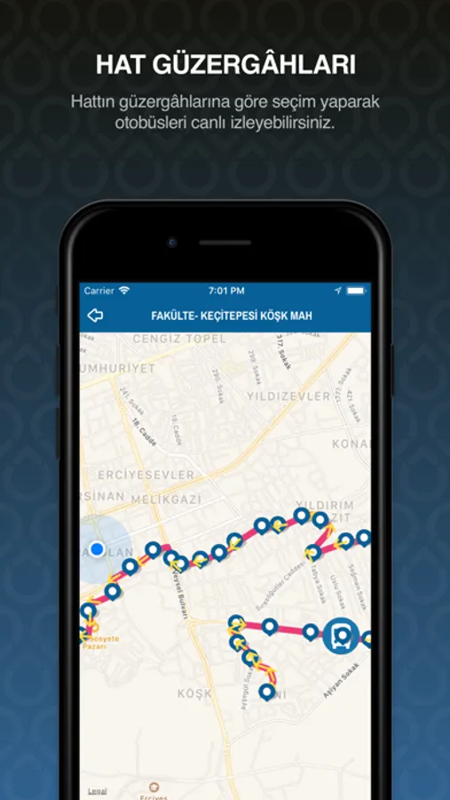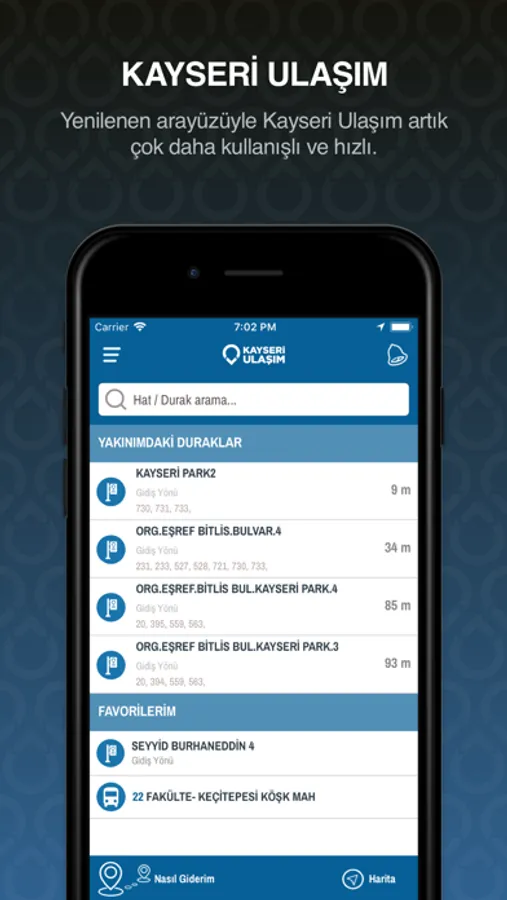 Mobil Ulaşım uygulaması ile dilediğiniz an, istediğiniz durağa ait otobüs güzergâh bilgilerine, varış saatlerine anlık olarak ve otobüse ait konumu cep telefonunuzdan takip edebilirsiniz.