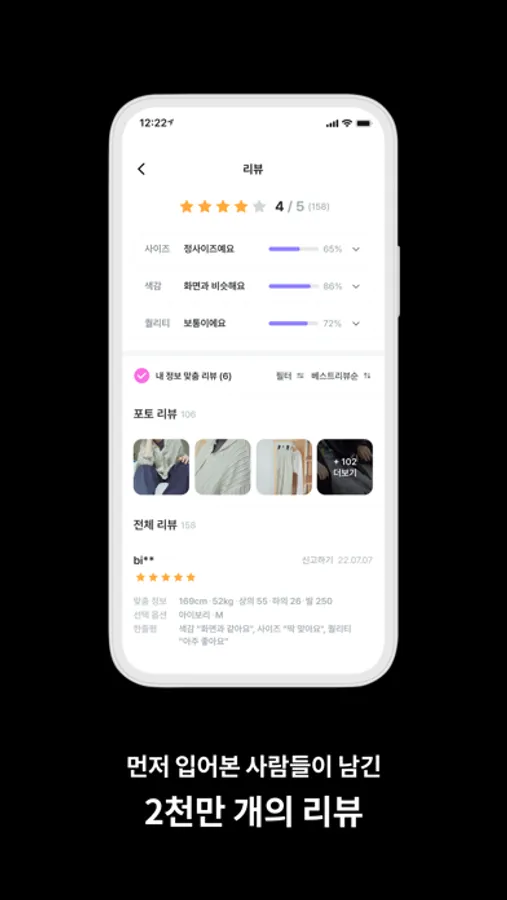 - 검색: 색상과 가격, 내게 맞는 기장과 소재까지. 정교한 필터 검색으로 한 번에 원하는 아이템을 찾을 수 있어요.