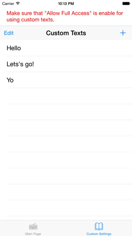 ※Make sure that "Allow Full Access" is enable for using custom texts.