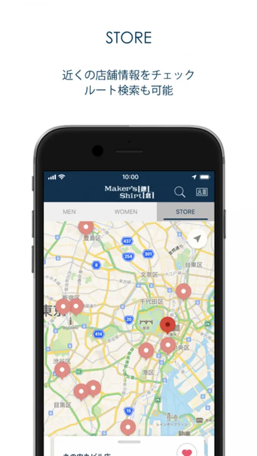店舗の営業時間・住所情報のほか、地図から最寄り店舗の検索が可能