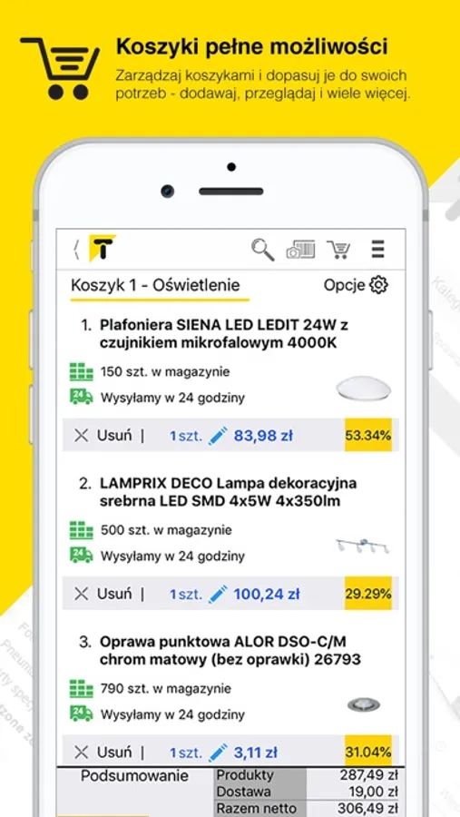 Koszyki pełne możliwości - Dodawaj, usuwaj oraz edytuj koszyki. Kopiuj, przenoś produkty do koszyków oraz schowków. Dodawaj adresy oraz osoby upoważnione do listy i jednorazowe. W łatwy sposób pracuj na produktach w koszyku.