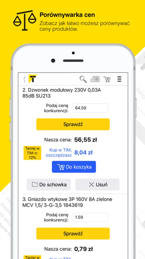 Wygodne wyszukiwanie - Wyszukuj produkty z każdego miejsca w aplikacji, podając: nazwy produktów, ich cechy (np. kabel yky 1kv), indeks producenta, indeks TIM SA, nazwę kategorii (np. źródła światła), nazwę producenta, kombinację nazwy produktu z nazwą producenta. Także głosowo bądź za pomocą "+" i "-".