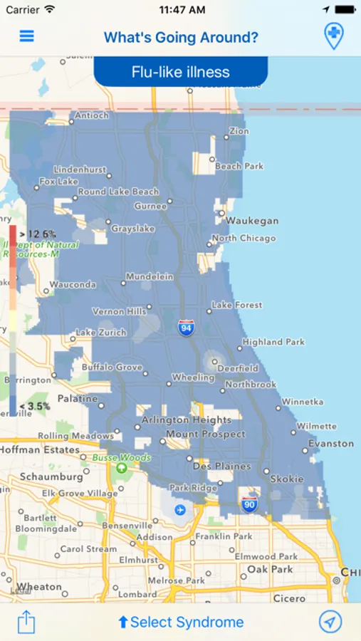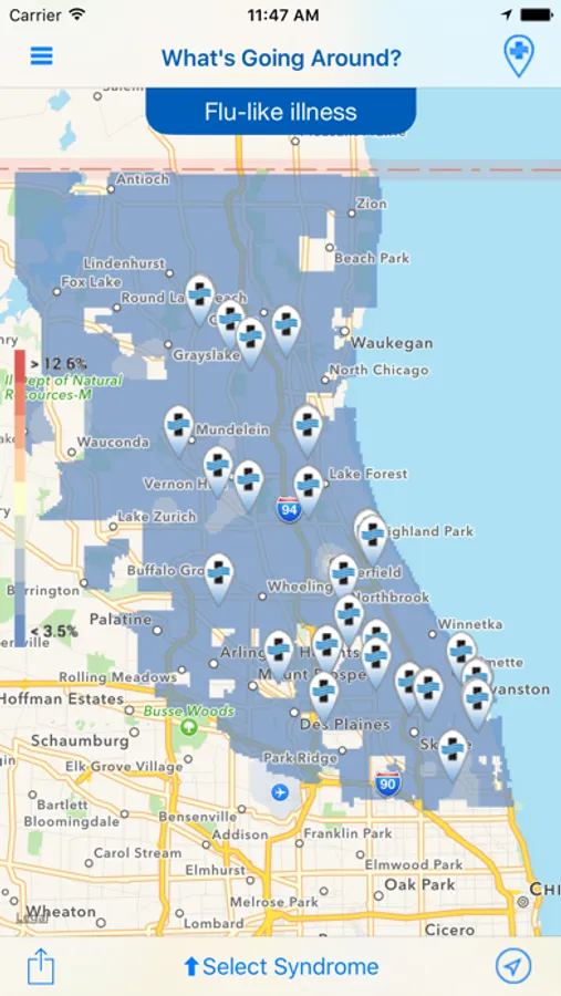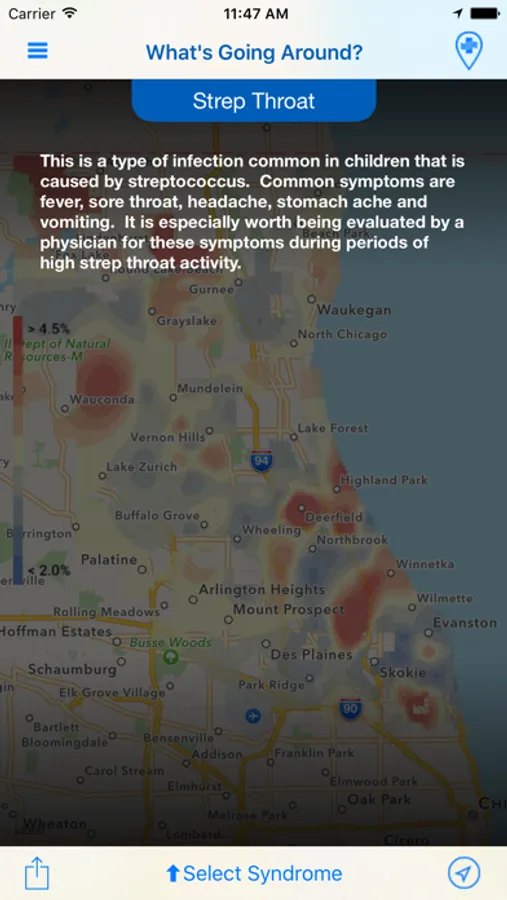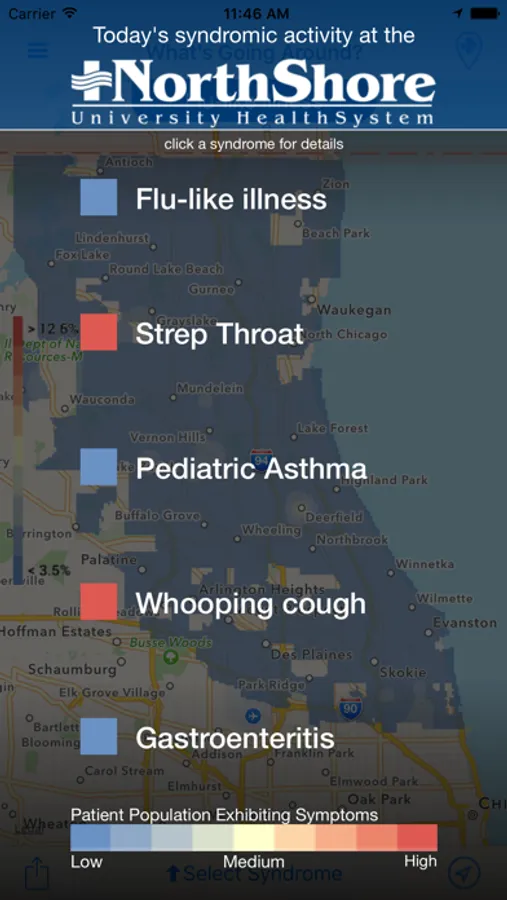 WGA is a graphical representation of particular illness/syndromes trending across NorthShore University HealthSystem in Chicago’s northern suburbs that is updated daily. Users can track syndromes such as strep throat and flu-like illness and see where cases are most prevalent. Based on daily patient data collected across our health care system, a geospatial heat map is generated for each syndrome that corresponds to the fraction of patients presenting that are positive (prevalence) for the syndrome of interest at a particular geographic location. Using historical data, the current prevalence can also be equated to an overall High, Medium, or Low for the entire region