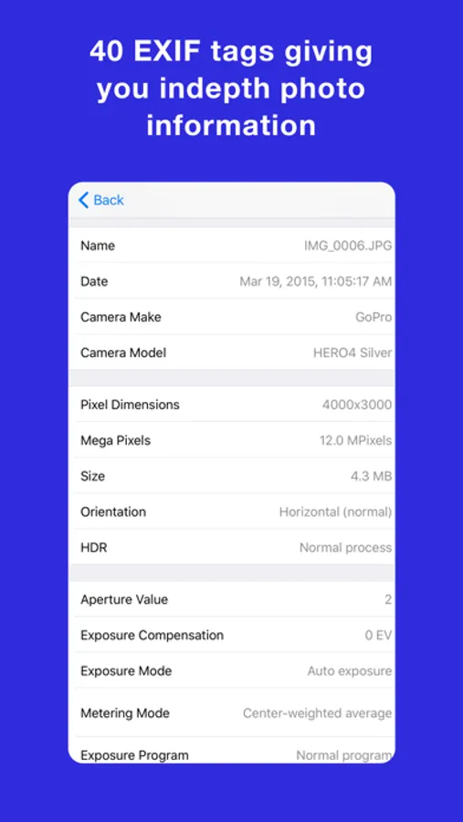 + Shows EXIF metadata like aperture, shutter speed, ISO, exposure and more.